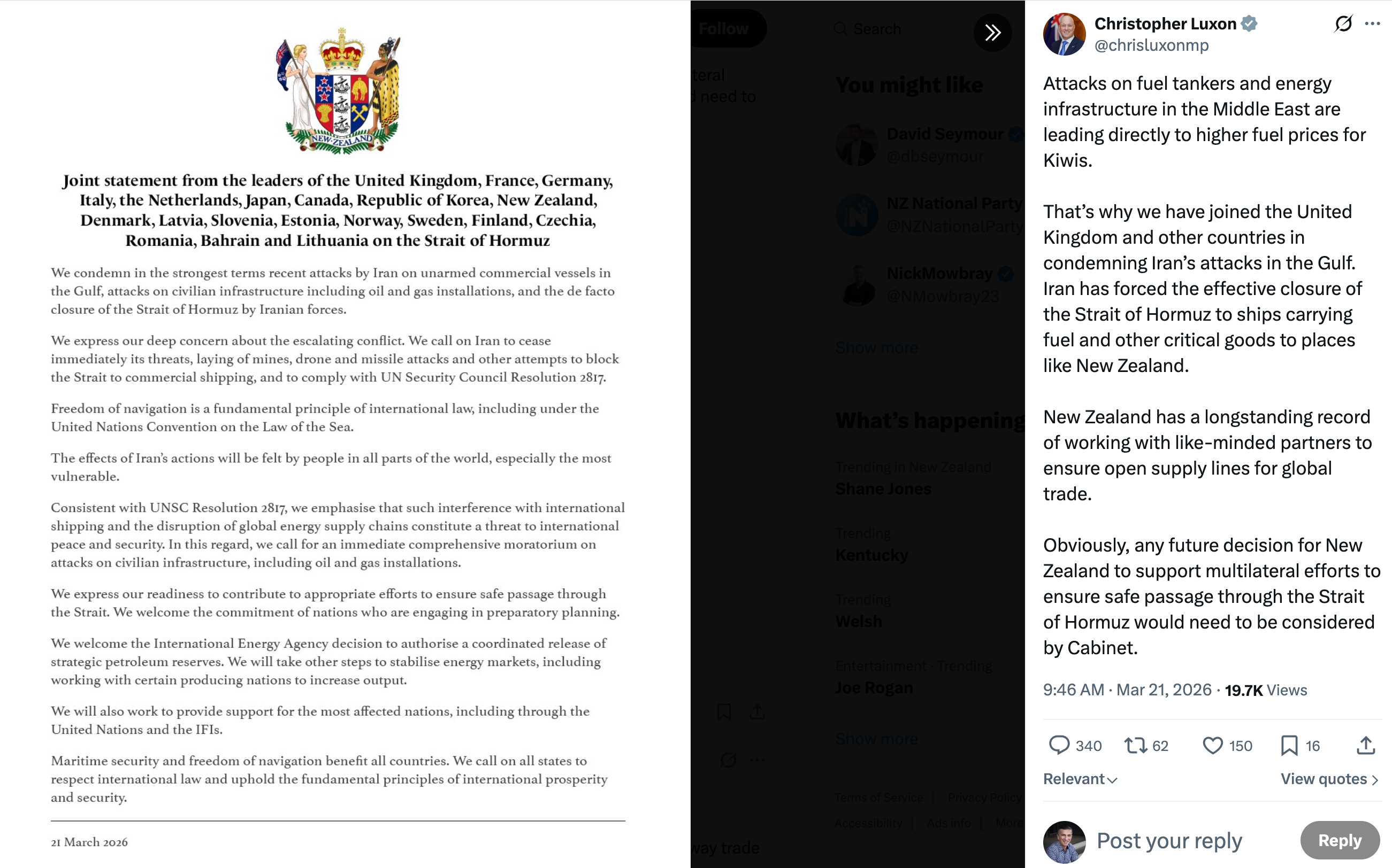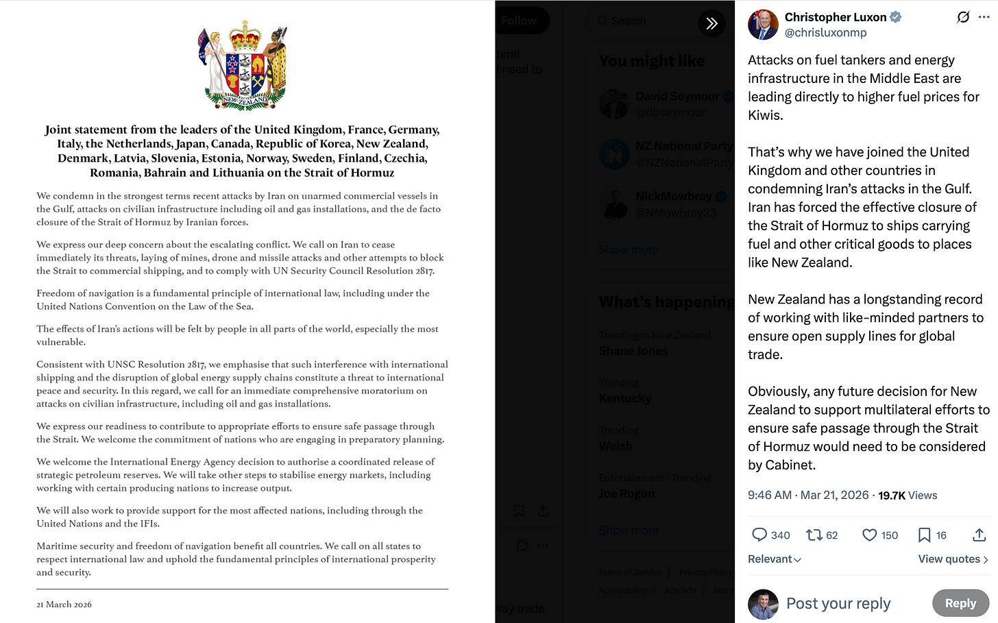Luxon signed up last week to a statement with other political leaders jointly condemning Iran’s attacks on vessels and energy infrastructure in the Persian Gulf and the effective closure of the Strait of Hormuz, which is squeezing global energy supplies.